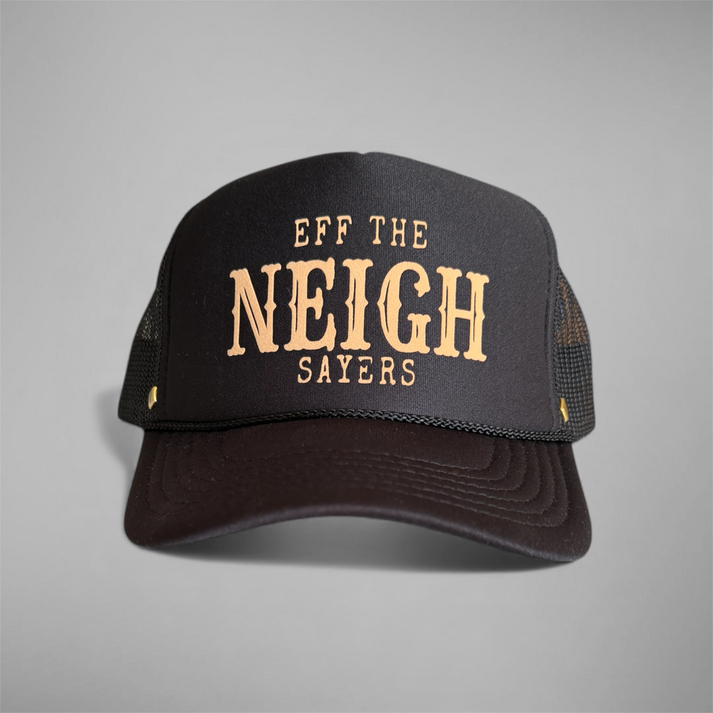 Experience a unique blend of style and comfort in oir“Eff the Neigh Sayers” trucker hat. The brass accents add that extra flare.